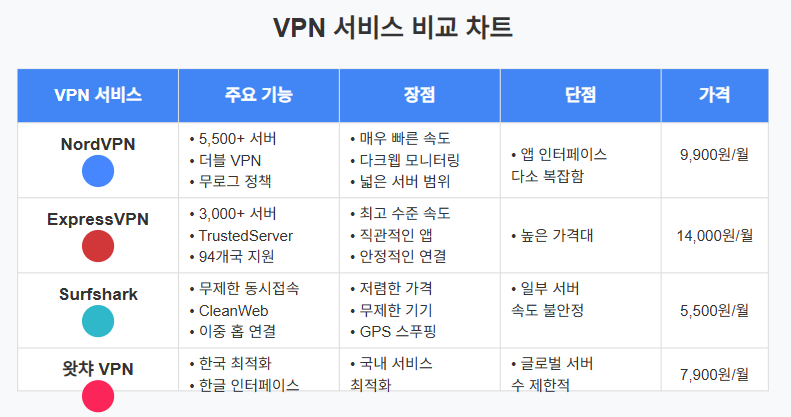 - 장점: 최고 수준의 속도, 94개국 3,000+ 서버, 직관적인 앱